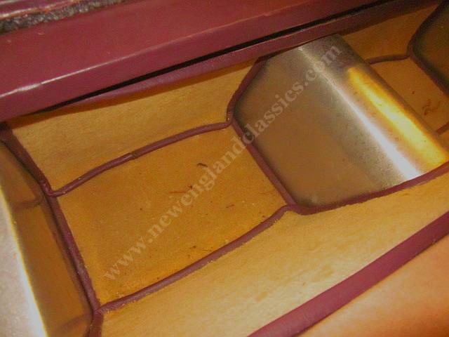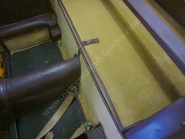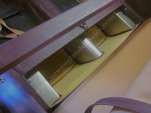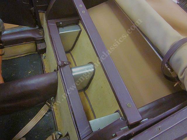 Behind the seats of any Morgan 2 seater is a wood board that covers the battery box and back axle. In this car, the wood board is upholstered and folds in half and in the area behind the seats, a compartment upholstered in wool carpets, bound in leather, and beautifully done. IS IT a luxury compartment for one's tools and equipment? Foot well to allow two kids to sit in the back behind the seats? Truly a mystery and like nothing we have ever seen in ANY Morgan.