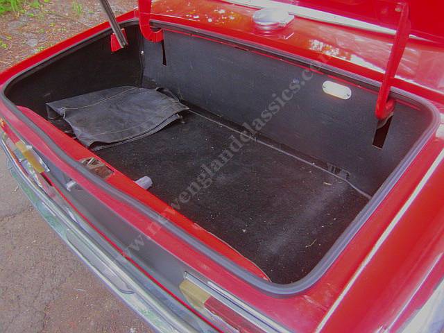 Top could very well be original and it looks fine, same with the boot cover. Engine bay is unusually clean, has an aluminum radiator and a nicely done metal shroud. Wood dash is not cracked and neither is the crash pad above it. Trunk is carpeted and very clean, and all of the exterior chrome appears to be new (no peeling, worn, or pitted).