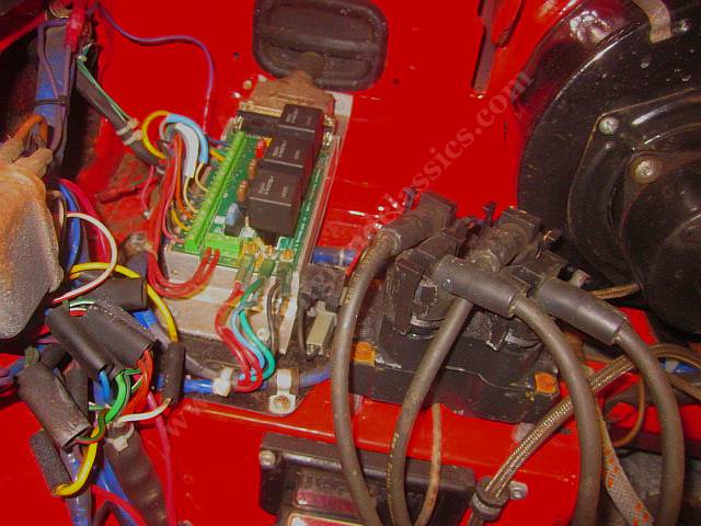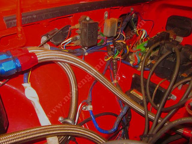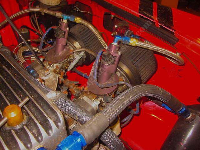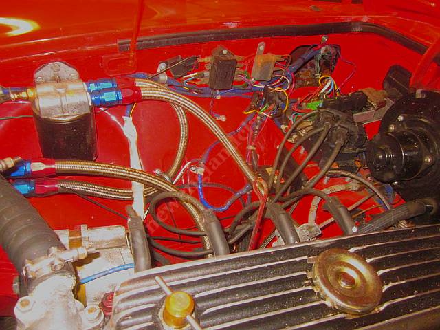Custom created, specially tuned, and remarkably effective fuel injection. Starts instantly, runs flawlessly, and not a carb in sight. Distributorless ignition, oil cooler, remote oil filter, Aeroquip braided metal lines in every direction in the engine bay, powerful radiator electric cooling fan, new wiring harness, nicely arranged relays and modern fuses, and (now, EVEN better).....