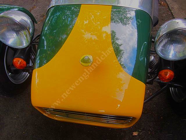 As my own car, have done a lot of little details to personalize it. Better dash switches, wind wings, better side mirrors and brackets, painted the fenders and nose in Lotus colors, and for fun, fitted Lotus emblems on the nose, steering wheel, shift knob, and even a Lotus ID plate in addition to the correct, original Caterham plate (sort of hidden).